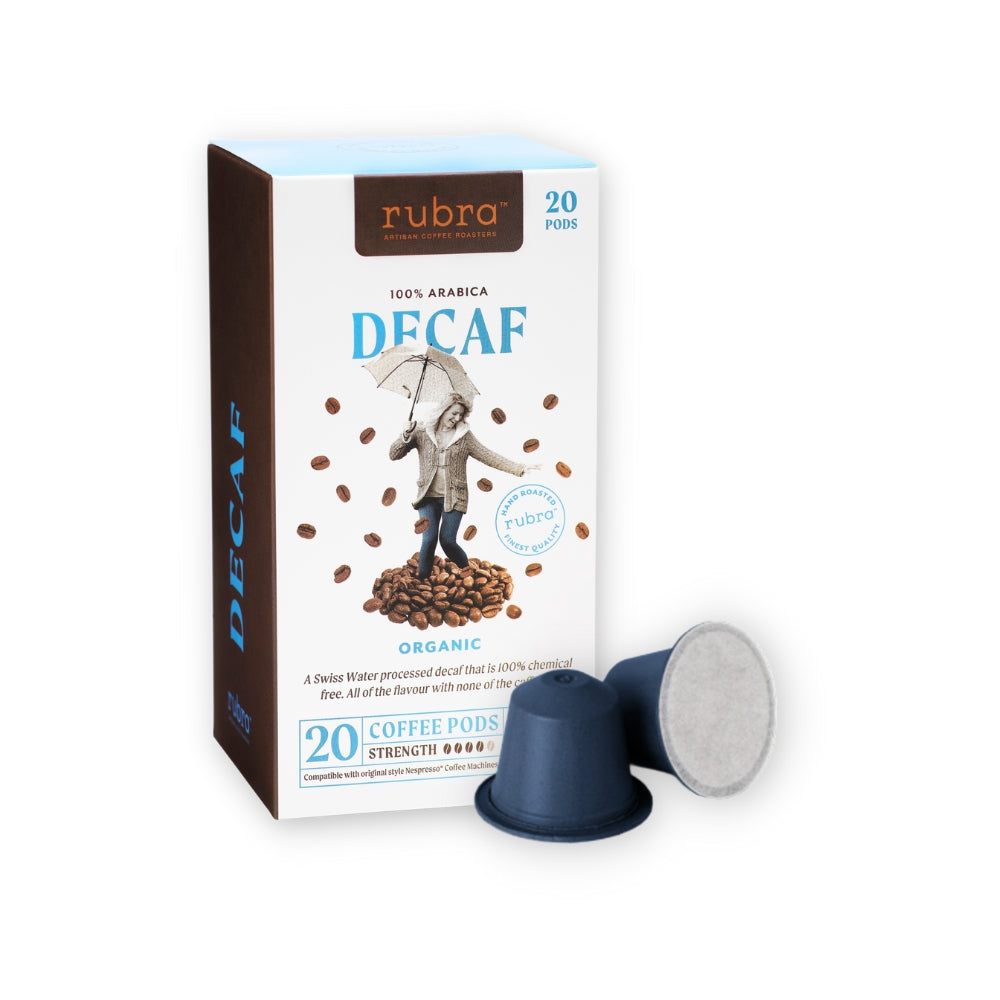 Rubra CoffeeOur award-winning Organic Decaf blend packed into coffee pods (compatible with original style Nespresso®* coffee machines). Each capsule contains our award-winning coffee and is blended, roasted and packed in Australia from quality imported beans.